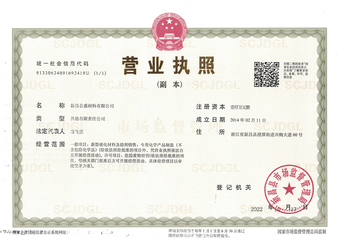 新昌公盛材料有限公司成立于2014年,坐落在江南大佛名城浙江新昌,地理位置優越,交通便利,并配備有現代化的廠房和實驗樓,總占地面積80畝。公司聚焦于研發和生產用于醫藥、農藥、染料、材料等精細化工領域的貴金屬催化劑。目前主要從事鈀炭、鉑炭、釕炭等多項催化劑及醋酸鈀、DPPF二氯化鈀、雙三苯基膦二氯化鈀、四三苯基膦鈀、DBA鈀等均相催化劑的研發、生產、銷售以及失效鈀、失效鉑催化劑的回收再加工等業務。公司成立以來,一直以提升客戶產品的競爭力為經營宗旨,通過持續改進客戶所用催化劑的性能,來提高客戶產品的收率,提高催化劑的套用次數,提高失效催化劑的貴金屬回收率,來降低客戶產品中貴金屬催化劑的成本,進而提升客戶產品的競爭力。